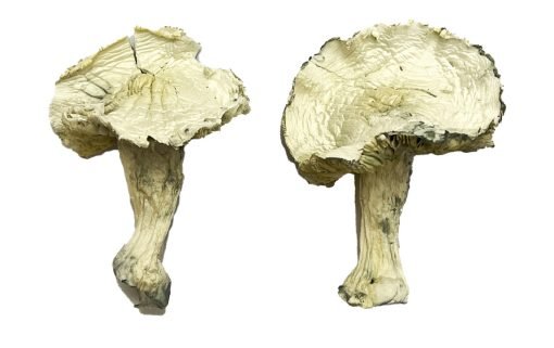 The Albino Zilla mushrooms are thick and sturdy. The colours are completely ghostly white with some dark bruising. The stems are shorter and the caps are relatively large. The caps are beautifully spread open.